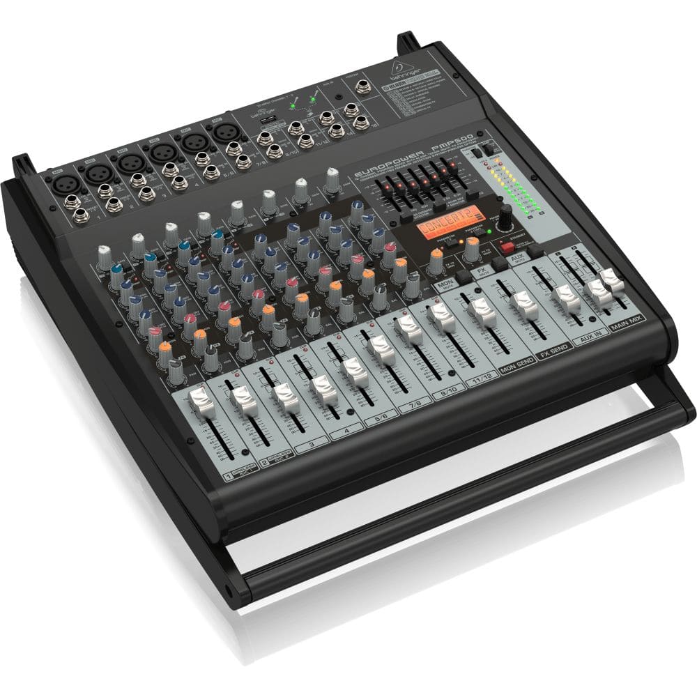 The amazing Behringer PMP500 Powered Mixer packs tremendous power (2 x 250 Watts, selectable as stereo or dual mono), while maintaining an incredible power-to-weight ratio. These mixers employ high-efficiency Class-D technology and a state-of-the-art switch-mode power supply, which significantly reduces weight and heat. The 12-channel PMP500 features 6 high-quality mic preamps (2 of which also accept our ULM Digital Wireless Microphones, available separately), our “one-knob” compressors, 4 stereo channels, plus 2 additional stereo inputs and 1/8" Aux Input for the maximum in versatility. To round out this phenomenal feature set, we added a KLARK TEKNIK 24-bit Multi-FX processor with 32 awesome presets, including studio-class reverbs, delays, pitch shifter and various multi-effects with dual-addressable parameters, Tap function and storable user parameter settings – and a 7-band stereo graphic EQ with our proprietary FBQ Feedback Detection System – for the ultimate in feedback-free performance.