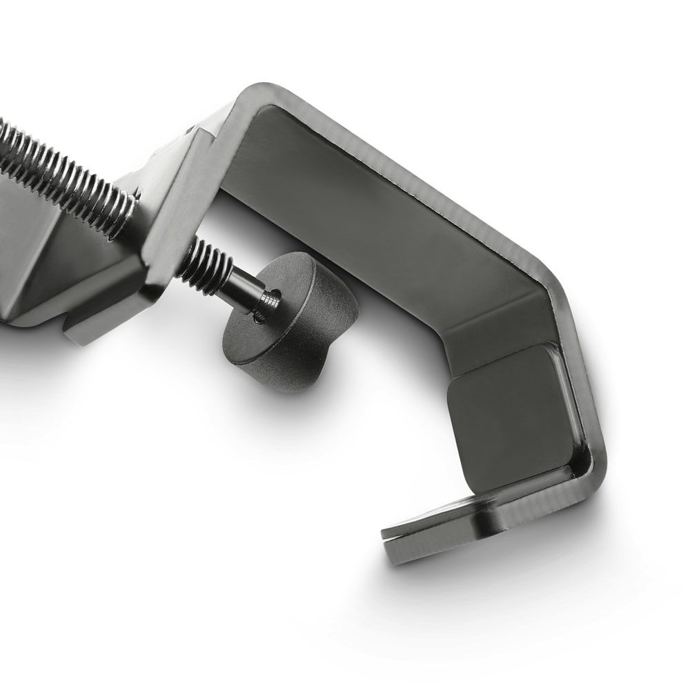 Made of black powder coated steel, the Gravity MAMH 01 clamps onto microphone or music stand poles with up to 30 mm diameter. It features a permanently attached 3/8" mic clip mount screw (mic clip not included).