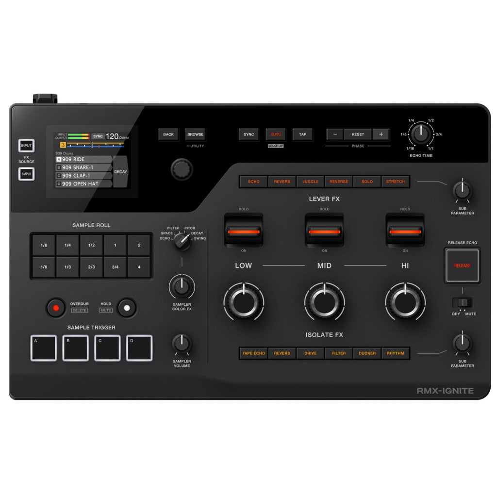 Create visually and sonically striking performances with the RMX-IGNITE by using the levers and large knobs to intuitively control its array of effects. Whether you’re playing in a club or on a live stream or video, you can captivate your audience by uniting sound and motion. It’s easy to make live remixes with the enhanced sampler section and you can add groove and expression to your samples with the new Groove Roll feature. And, with the latest DSP and high-grade audio converters, the unit delivers professional-level sound quality.