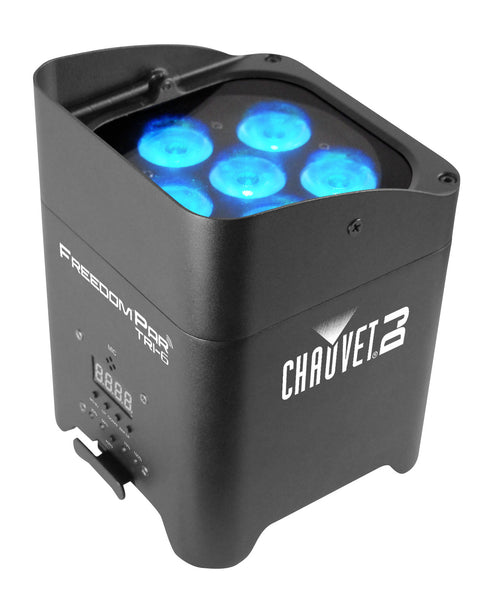 Freedom™ Par Tri-6 is powerful, bright, and truly 100% wireless with a rechargeable battery and a built-in D-Fi™ transceiver. Freedom™ Par Tri-6 has 18 watts of RGB color mixing and can be operated with the control panel, the included CHAUVET® DJ IRC-6 remote, or from any mobile phone or tablet running the FlareCON™ mobile app. Freedom™ Par Tri-6 fits perfectly inside TRUSST® and all other 12” box truss, and travels safely and stylishly in the CHAUVET® DJ CHS-FR4 VIP Gear Bag.
