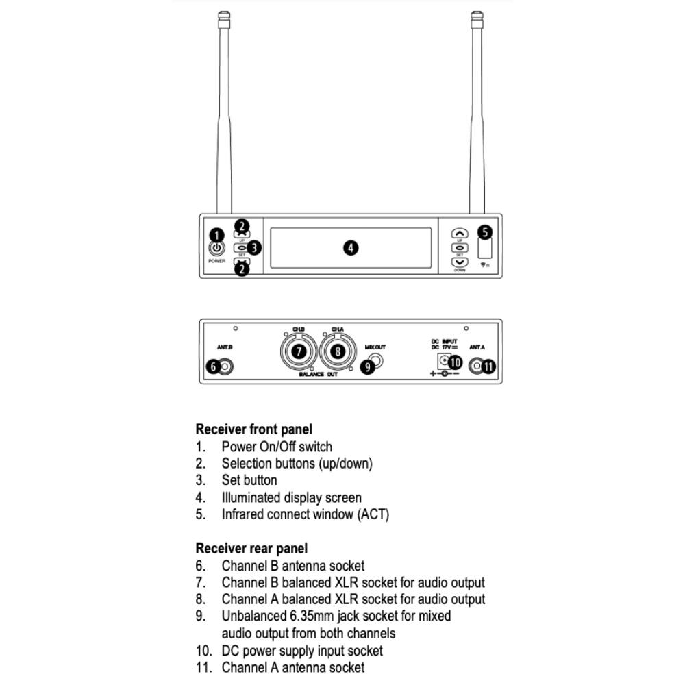 - Multi-channel UHF PLL receiver with 2 x bodypack transmitters