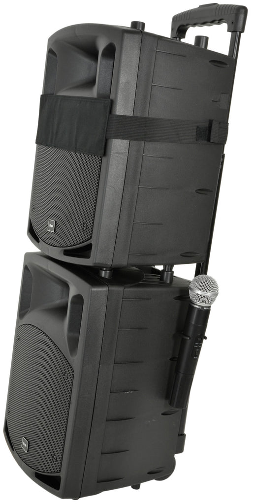 Portable PA set comprising a main active unit and passive satellite speaker. The main unit has a media player with options for playback from USB stick, SD card, Bluetooth or a slot fed disc player for CD and DVD. A pair of UHF handheld microphones are included in addition to 2 inputs for wired microphones with a built-in echo effect for vocalists and a VCV control enables mic priority over music.